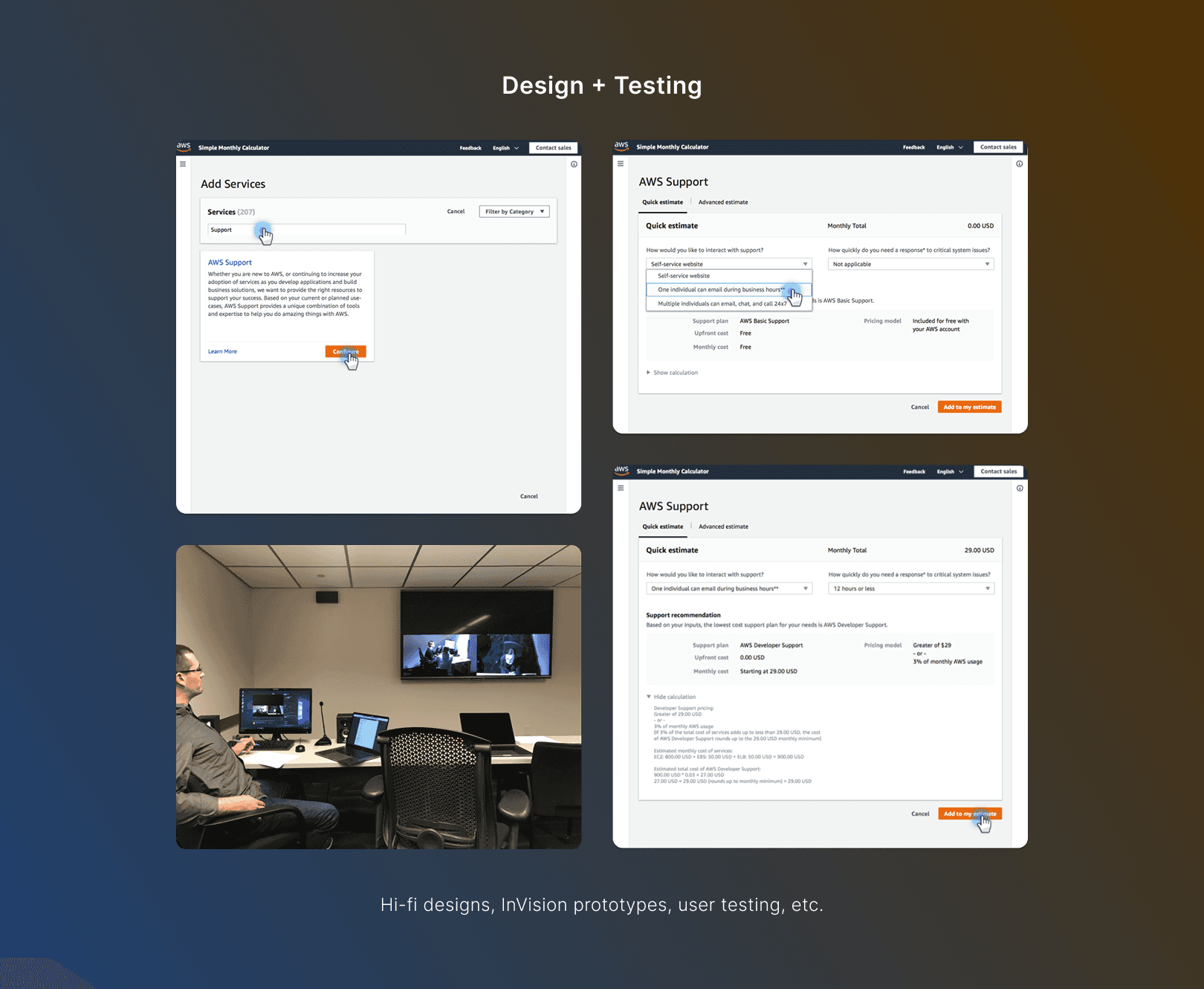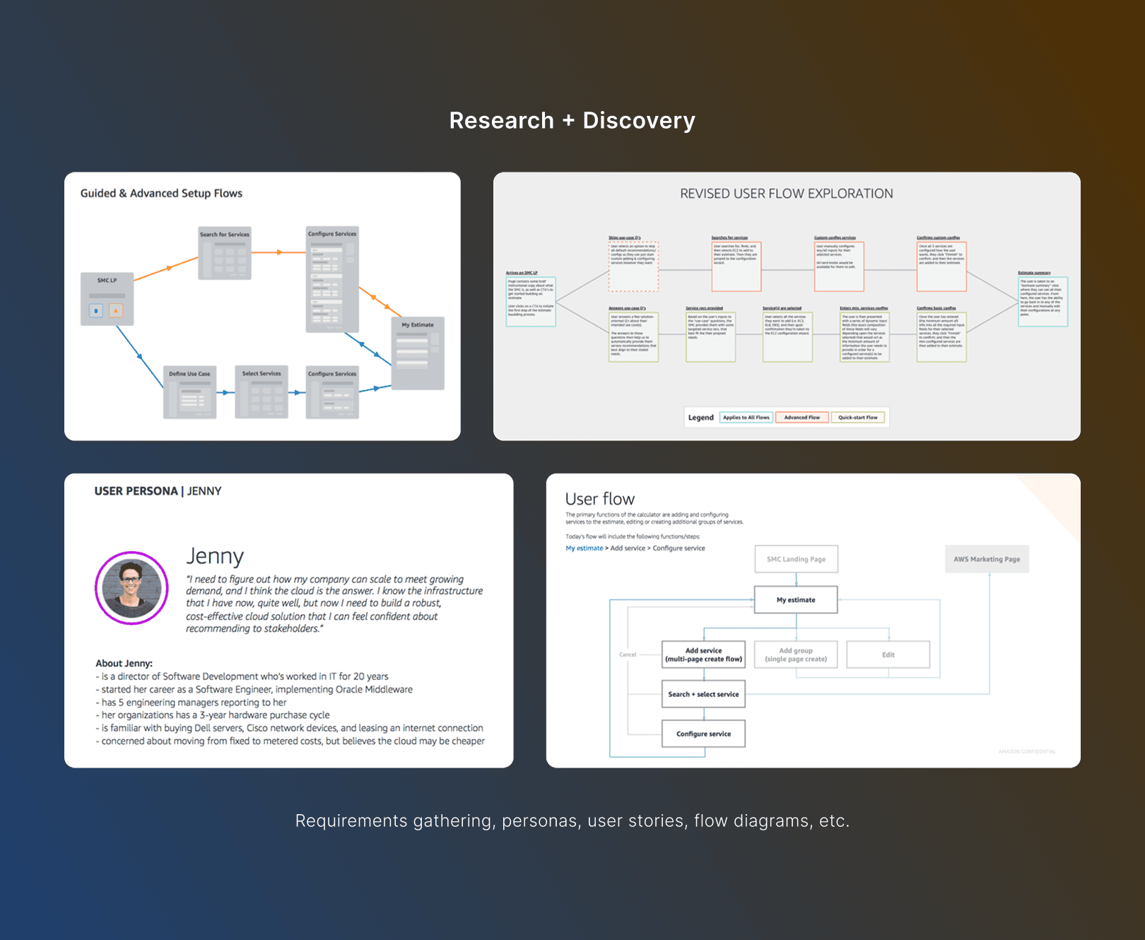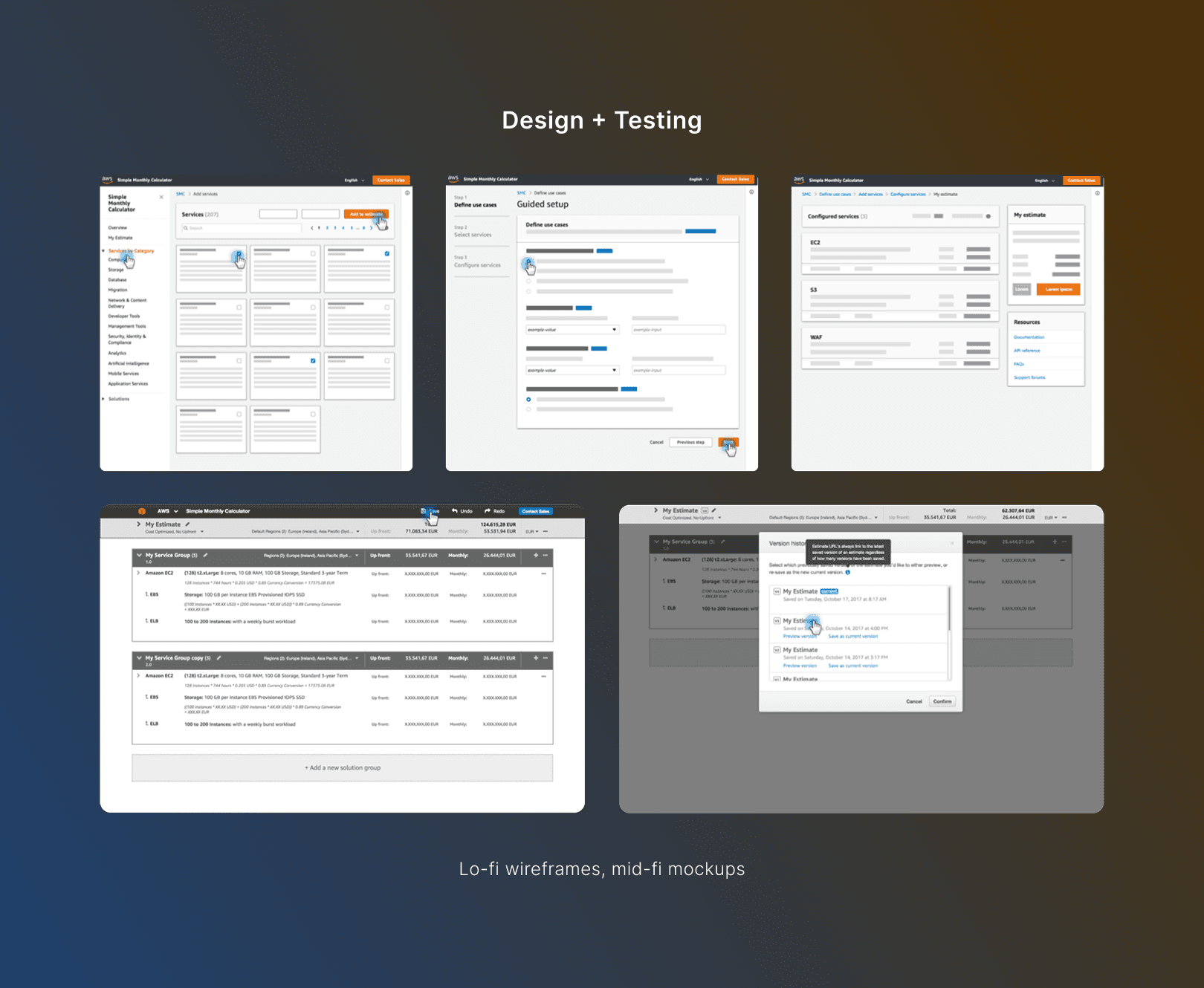 I partnered closely with product, engineering, and business stakeholders to define the redesign strategy, clarify requirements, and map the core user pain points with the legacy tool. Using Amazon's "Elastic Cloud Compute" (EC2) product as our pilot case—the most frequently modeled product on the calculator—we explored what a reusable, self-service calculator creator platform would need to support. I developed user stories, personas, conceptual models, and early interaction patterns, and led iterative usability testing with internal users to validate platform constraints and improve calculator workflows. As we moved into high-fidelity designs and interactive prototypes, we collaborated deeply with the Polaris Design Team to ensure system alignment while also contributing new components and design patterns shaped by the platform’s requirements.