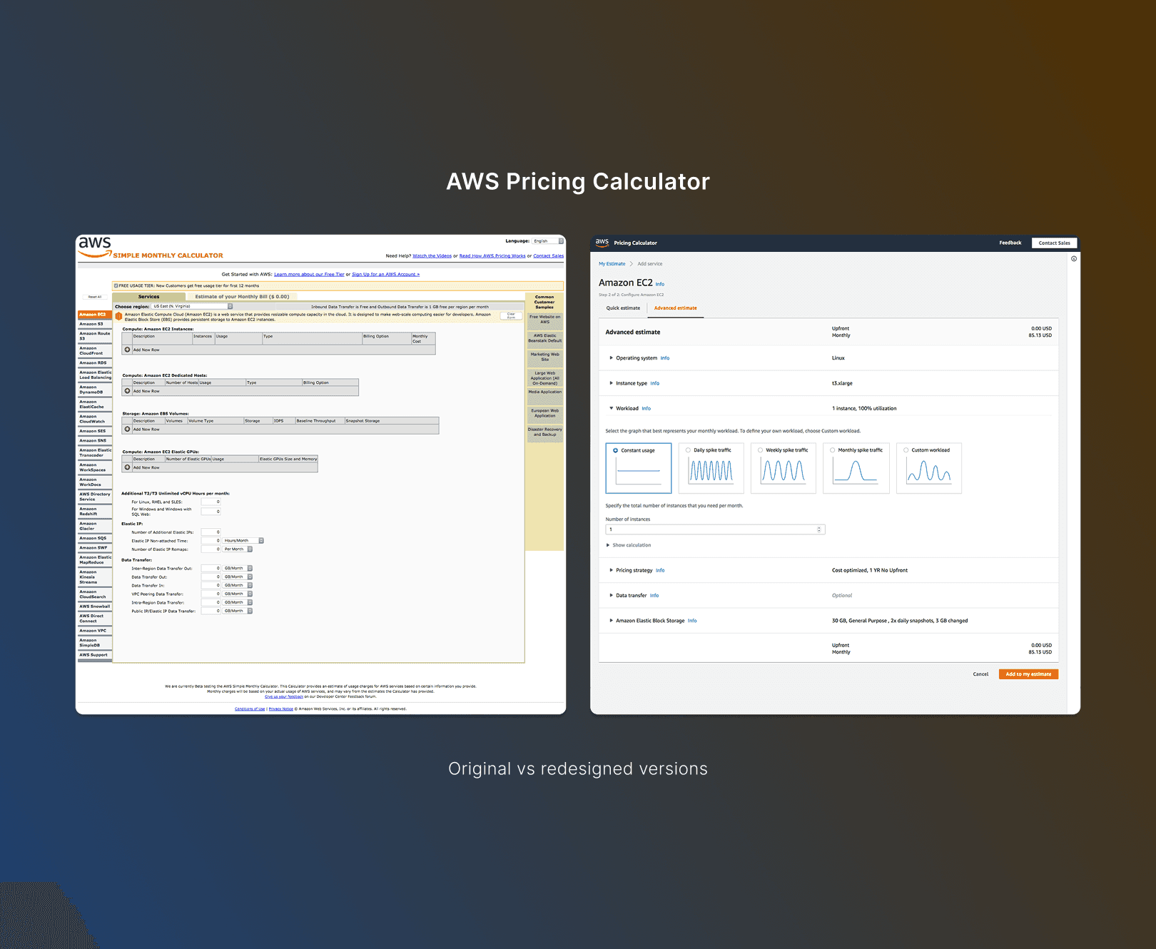The AWS Pricing Calculator is a mission-critical tool used by business decision makers and solution architects to estimate the cost of adopting AWS services. By 2018, it had fallen far behind modern UX standards, with an outdated interface, inconsistent branding, and a confusing workflow that pushed users—including AWS’s own teams—toward third-party alternatives. I joined as the lead UX designer to modernize the site’s architecture, navigation, and core workflows, migrate the experience onto the new Polaris design system, and help establish a flexible calculator-building platform that AWS service teams could use to create and maintain their own product-specific calculators.